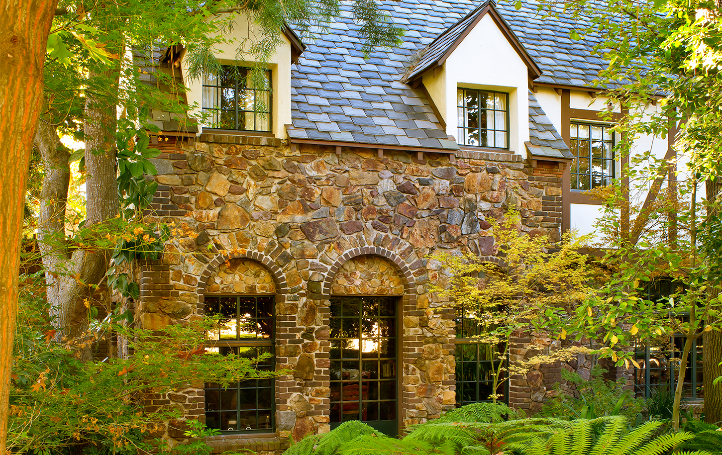 The next step in restoring the Tudor-style estate included the addition of a new 1,300 square feet gardener’s cottage and authentic English-style gardens surrounding the property. Special interior design details in the cottage, such as the hand-hewn structural trusses, wrought-iron banister detail, and stonework, are replicated from the main house, blending the new structure seamlessly with the old. The gardener’s cottage and greenhouse are connected to the main house by wood-trellised patios with stone pillars, echoing the stonework found throughout the rest of the property.