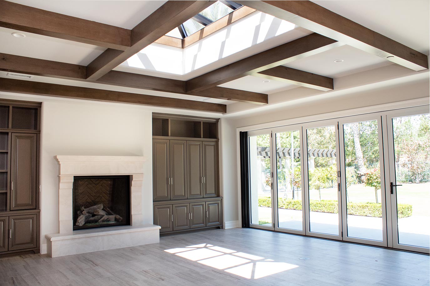 The previous kitchen had a bulky peninsula that isolated the room and did not allow for a seamless connection to the adjacent areas. The newly designed kitchen has a more open and functional layout while maintaining the architectural style of the home. Another major aspect of this remodel included an enclosure of the existing patio into a new great room additions and second-story deck. The new deck above the great room, meticulously constructed by our team of luxury home builders in Orange County, CA, has a custom hip-ridge skylight with tempered glass. The new skylight harmonizes with the coffered ceiling in the great room. A new gas fireplace with stone surround ties in beautifully with the new flooring.